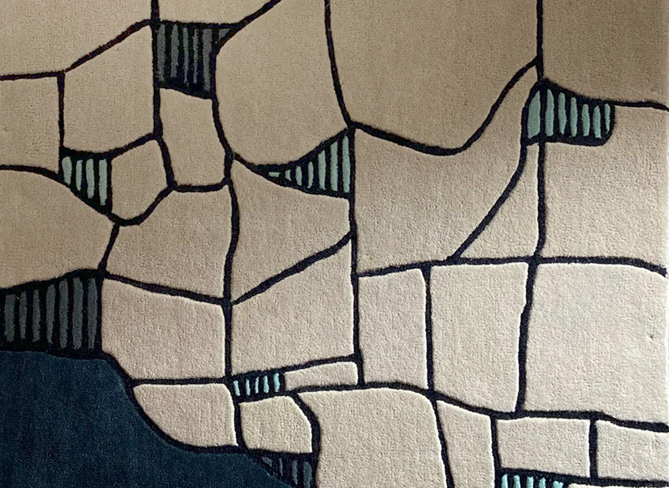 Le choix de la laine, des boucles et des zones rasées, dont certaines volontairement abrashées, crée une cartographie sensible, où chaque teinte évoque une variation de lumière, de sol ou de saison. Cette pièce explore la relation entre territoire et abstraction, et met en valeur le savoir-faire artisanal à travers une lecture contemporaine du paysage rural.